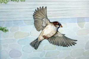 Malham visitor centre illustration of a garden and birds natural history illustration by Lizzie Harper detail sparrow