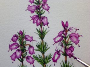 Step by step botanical illustration of Bell heather Erica cinerea by Lizzie Harper wet wash