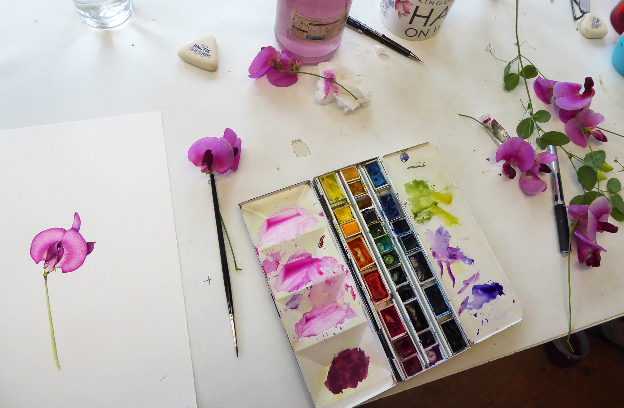 Used paint box and sweet peas with paint brush