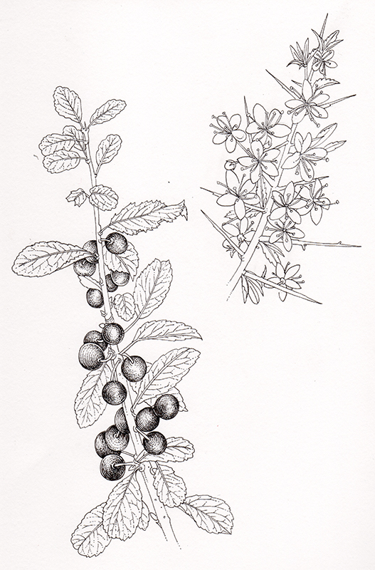 Blackthorn Prunus spinosa with a sprig showing spine, leaves and fruit and the other sprig showing blossom