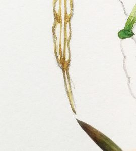 Painting the tip of the silique seed capsule painted in watercolour by botanical illustrator Lizzie Harper