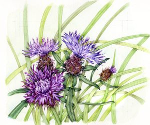 Rough Star Thistle Centaurea aspera botanical illustration by Lizzie Harper copyright Jersey Stamps 2020