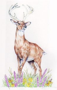Deer colour rough with flowers artwork for Wild Shreds petfood copyright spot farms 2019 natural history illustrations by Lizzie Harper
