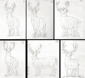 Deer initial thumbnail rough sketches artwork copyright spot farms 2019 natural history illustrations by Lizzie Harper