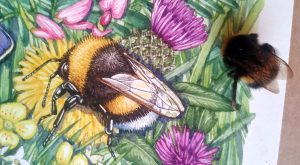 Bumble bee with specimen natural history illustration by Lizzie Harper