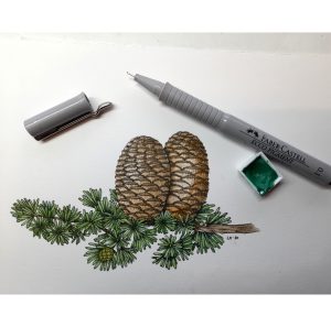 Cedar of Lebanon pen and ink illustration with colour top wash and Faber castell pen