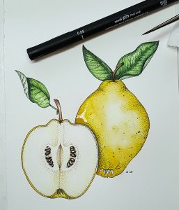 Quince fruit in pen and ink with watercolour top wash and Unipin ink pen