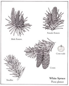 White spruce Picea glauca cones flowers needles layout with text