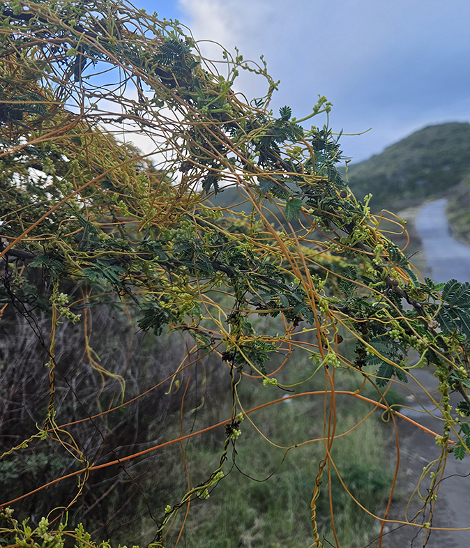 Seeing it grow, I realise it grows like Dodder Cuscata in the UK. And looking closely, the colours on individual tendrils do indeed fade from light green through yellow to a rich orange. This plant was my happiest comparison.