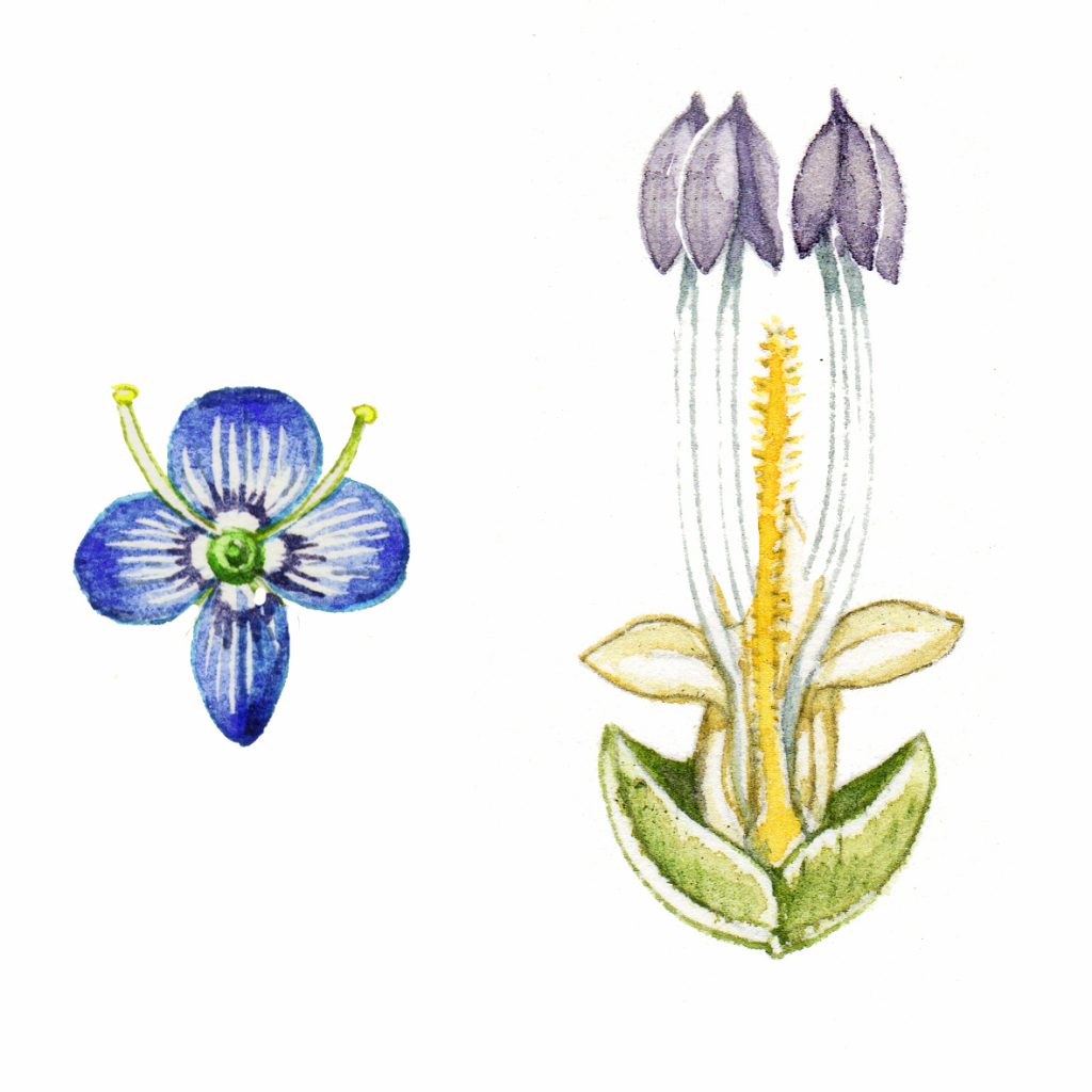 Speedwell flower with 4 stamens and Plantain flower with 2 stamens