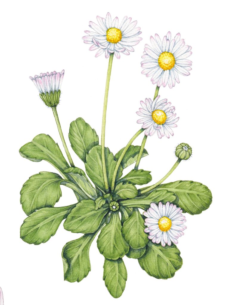 The species in this section that I’d not yet painted is the common Daisy, Bellis perennis. It’s odd, with the species I get asked to illustrate, sometimes the most ubiquitous plants fall through the cracks. I’ve been illustrating plants for 25 years, and this is the first time I’ve been asked to illustrate a daisy. It was a real joy to find the perfect specimen on the lawn and rectify the situation. The illustration takes the basal rosette of one plant and the flowering heads of another. The benefits of illustrations instead of photography (for more about my feelings on this, check out my FAQ section, but be prepared for a balanced view. Both are vital tools.).