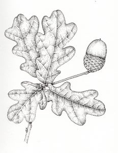 Oak Quercus robur acron and leaves botanical illustration by Lizzie Harper