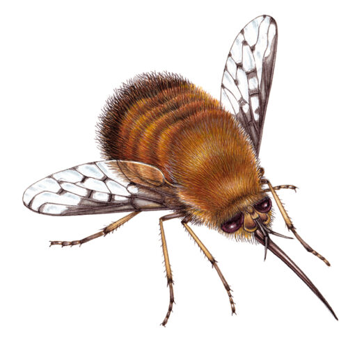 Dotted bee fly Bombylius discolor illustrated for South Devon National landscape