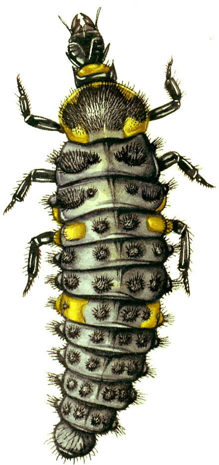 Ladybird larvae Coccinella showing yellow and black colour and distintive shape of this active grub