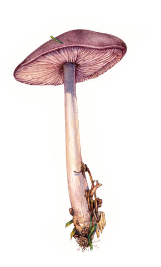 Rosy bonnet mushroom Mycena rosea with stipe base and detritus