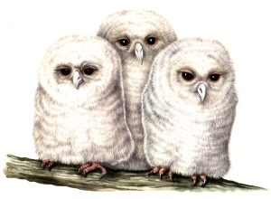 Tawny Owlets Strix aluco sitting clustered together on a branch covered in grey down feathers
