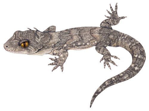 Te Mokomoko a tohu Gecko Hoplodactylus tohu showing pronounced brillar-fold, reduced infralabial fourth scale, and yellow eye. Coommissioned by the scientist who recently discovered this new species.