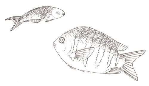 Blue headed wrasse Thalassoma bifasciatum & Sargent major Abudefduf saxatilis pen & ink