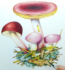 Plums and Custard Fungus tricholomopsis rutilans cap top moss