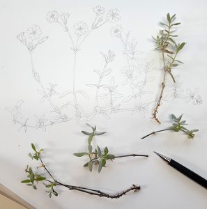 Snow-in-summer Cerastium tomentosum plant and line drawing with pencil
