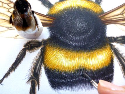 Using lots of tiny strokes to add texture, she plots in her darkest shadows